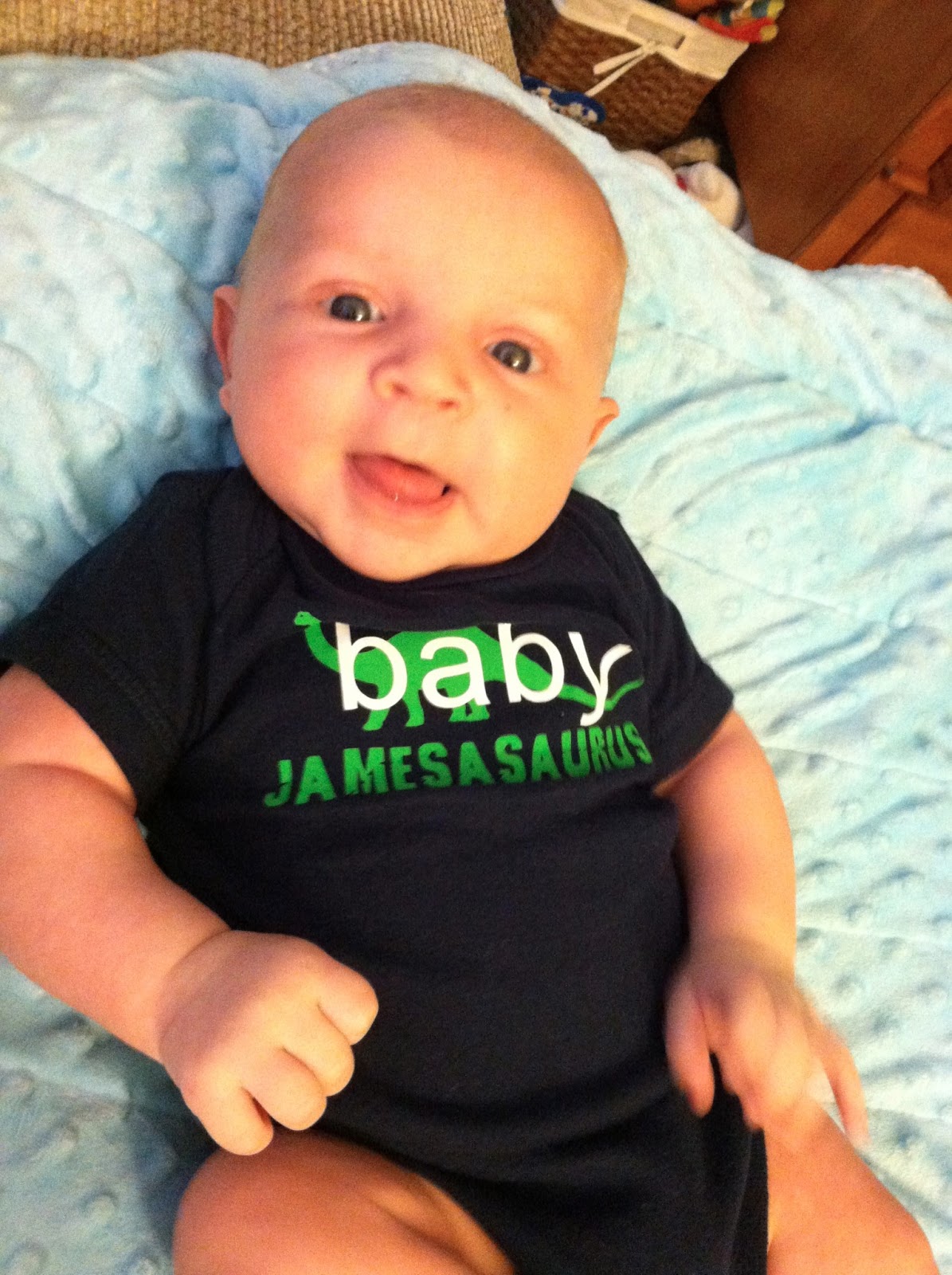 It's amazing how time flies by. James used to be a little 8 pound baby with no neck or body control, limited vision, and a propensity for pooping all.the.time. He still poops all the time, but he has grown so much. His personality is starting to show through. He's impatient and stubborn like his mommy and curious like his daddy. He loves to be held, rocked, and patted, and hates being put in the car seat-but loves car rides. He is now 12 pounds, 6.6 ounces (as of July 2), 23 inches long, tracks objects with his eyes much better, his fine motor control skills are improving every day, and he is smiling. He sleeps through air shows, fireworks, and shattering glass, but wakes up if I cough. He loves blowing spit bubbles and having his chin and cheeks tickled. Our little boy is already turning into a little man! He is in the 84th percentile for weight and 75th percentile for height. He is all cheeks and chin and has almost no neck. During bath time we occasionally see it, but Matt says it's an optical illusion.